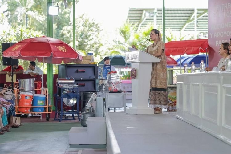 Enseguida, la gobernadora hizo entrega simbólica de los apoyos, entre los que destacan entrega de equipamiento para proyectos de Salón de Uñas, Barbería, Venta de Antojitos, Tortería, Raspados, Aguas Frescas, Tamales y Atoles, Elotes y Esquites, Panadería, Carnicería, Pollería, Tortillas Mano, Hot dogs y Hamburguesas, Carpintería y Reparación de celulares.